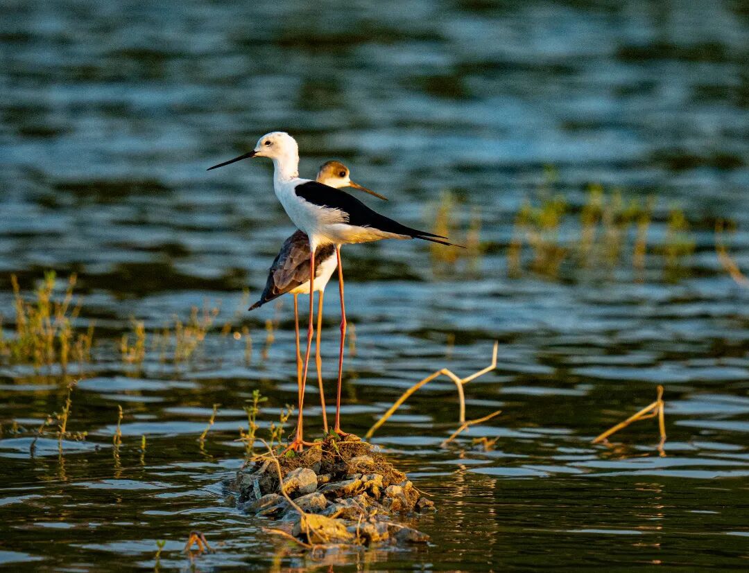 另外两只长脚鹬立于岸边