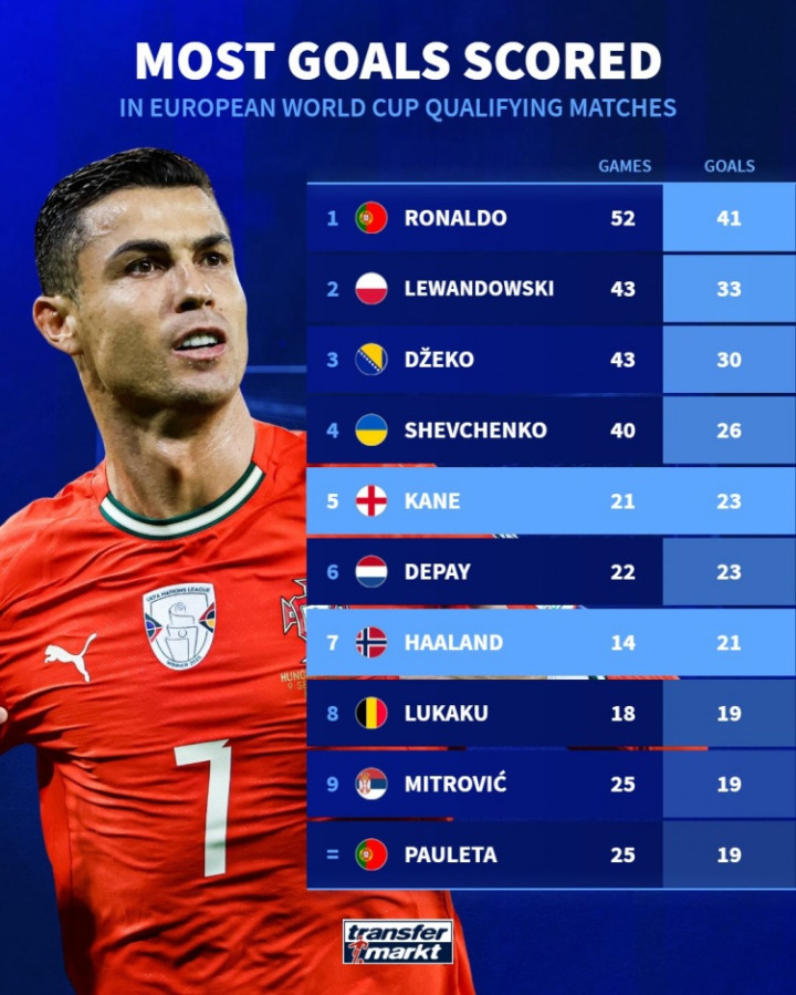 直播吧11月17日讯德国转会市场列出了欧洲世预赛历史射手榜,C罗41球居首,莱万33球次席,哈兰德21球排在第7位。