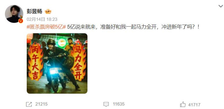 在这样的情况下,截止2月14日18时间,彭昱畅主演的《匿杀》票房竟突破5亿,这部电影是一部悬疑电影,讲述的是:一本出现在血案现场的死亡漫画,竟接连预测多人被杀害。